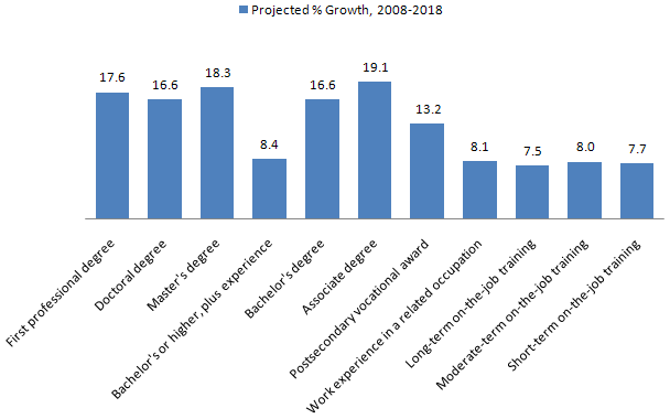 It's no secret that education directly affects employment. To give you an idea of just how true that is, here's a great graph illustrating how careers that require a higher level of training are projected to grow from 2008 through 2018, according to the U.S. Bureau of Labor Statistics: